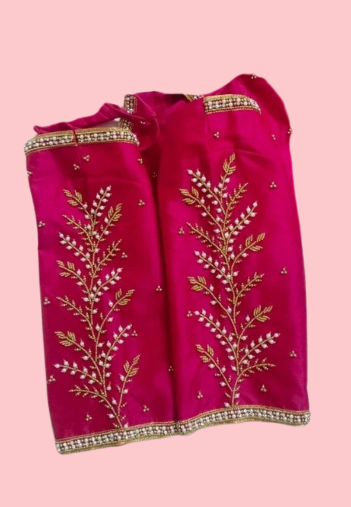 A custom Aari work blouse is tailored to your fit and style, featuring handcrafted embroidery that beautifully blends tradition with personal elegance.